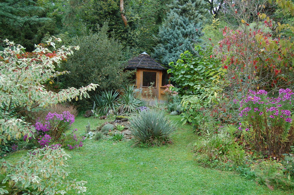 mit einer weiteren kleinen Drehung nach re erkennt man die Laube mit der alten Cupressus arizonica Glauca re daneben, davor Cercis sin.'Avondale' AM#