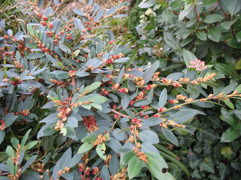 ist der elegante /*Distylum myricoides*/. Die roten Blüten sind zwar winzig, wirken aber doch in ihrer Masse. Nach bisherigen Beobachtungen gut winterhart, der Wuchs eher in die Breite.