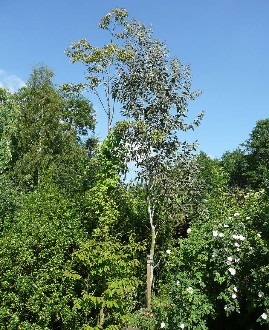 mein Boeser Willi (/*Eucalyptus debeuzevillei*/) hat die 7 m-Marke deutlich ueberschritten. Hier sieht man ihn in Gesellschaft von Diospyros lotus (links >7 m hoch), von Akebia quinata umrankt, unten auch als Busch, ganz unten Aesculus pavia Koehnei, rechts Rosa canina, links Ilex aquifolium u. a.