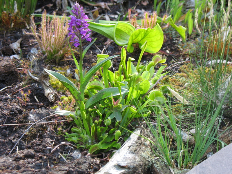 Venusfliegefalle Dionaea muscipula bekam ich u. a. letztes Jahr von Christian/Südpfalz zur Erstausstattung des Moores. Die Orchidee war quasi ein uneingeplanter "Beifang". Erstaunlich was so alles unverhofft aus diesen ausgestochenen Moorsoden herauswächst