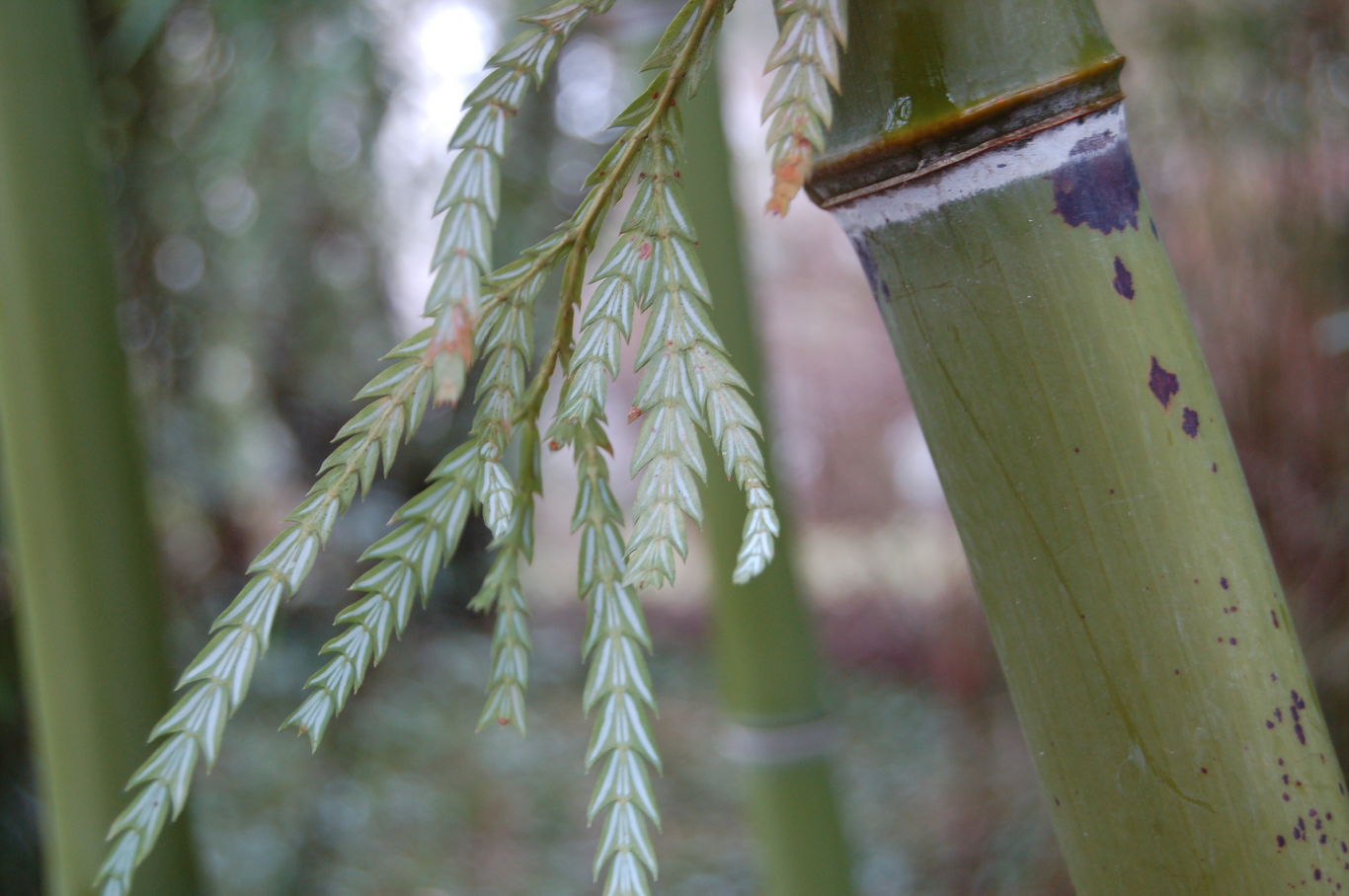 , wie z.B. /*Fokienia hodginsii*/ neben Phyllostachys vivax. Durch den Schnee haben sich viele Äste vergreht, sodass die Unterseite nach oben kam![]()