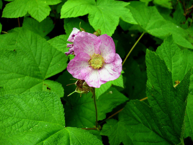 ..und hier /*Rubus odoratus*/ aus dem oestlichen Nordamerika. Gedeiht vorzueglich im Schatten und ist mit seinen etwa 4 cm breiten Blueten sehr zierend. Allerdings total winterhart und daher kein Exot im engeren Sinn...