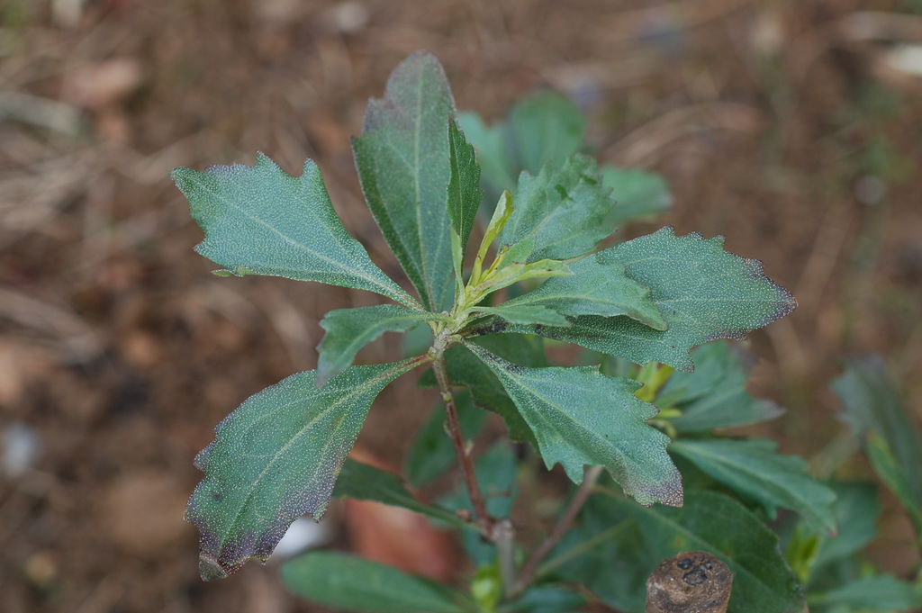 /*Baccharis halimifolia*/, immergrün,blaugrau, nicht sehr hoch werdend mit dekorativen Blättern