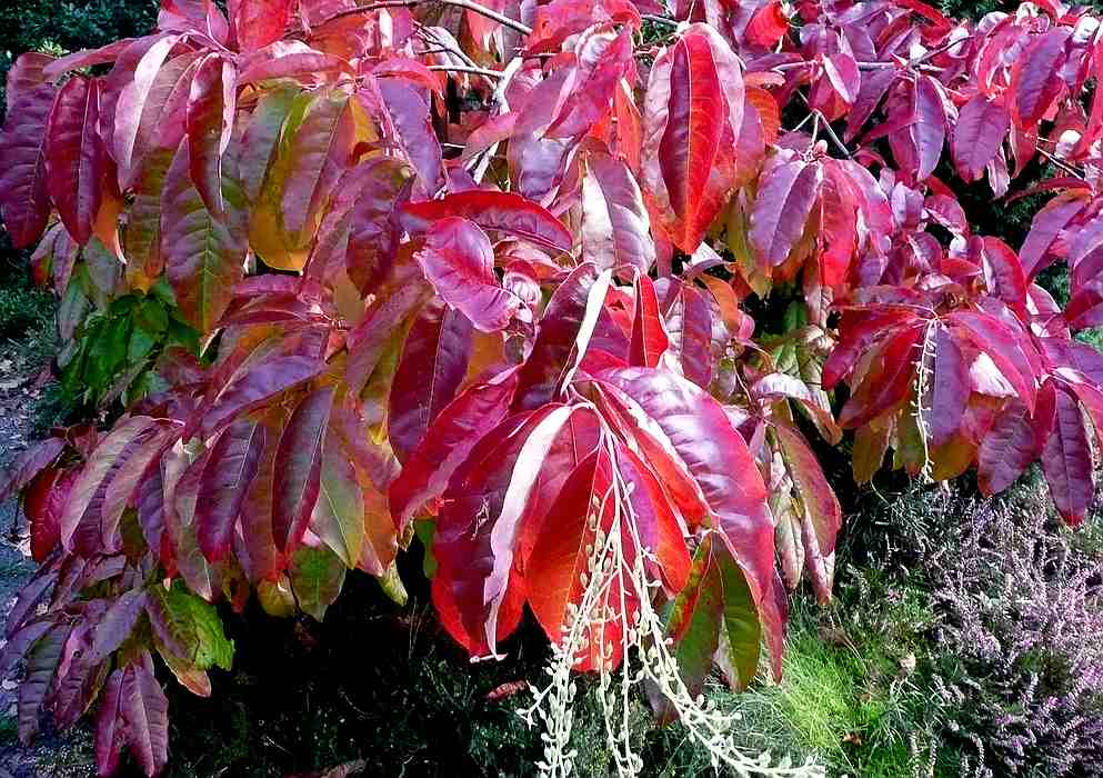 Der unübertroffene Herbstfärber ist /*Oxydendrum arboreum". Es ist die Art, die im östlichen Nordamerika die stärksten Akzente für den Indian Summer setzt. Mein Exemplar ist knapp 3 m hoch. Zu sehen ist hier nur der unterste Teil, leider wetterbedingt nicht so sonnendurchglüht, wie es sein könnte. Aber dennoch ist der flammende Strauch weithin auffällig.