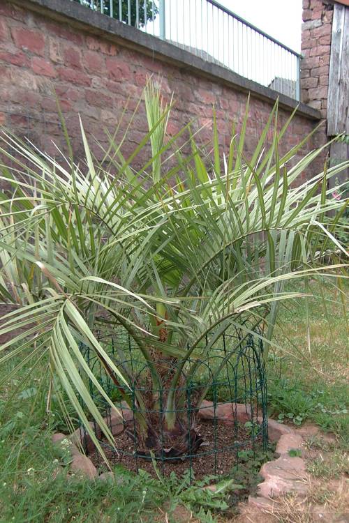 unten mal ein Bild von meiner seit 2000 ausgepflanzten Butia,die ich 1999 bei Otto Eisenhut für 75 Fränkli gekauft habe.Das Wachstum ist bisher nicht so ganz zufriedenstellend außer im Supersommer 2003.Im letzten Winter hat sie ertmals einen kleinen Triebschaden bekommen,der aber jetzt wieder rauswächst.