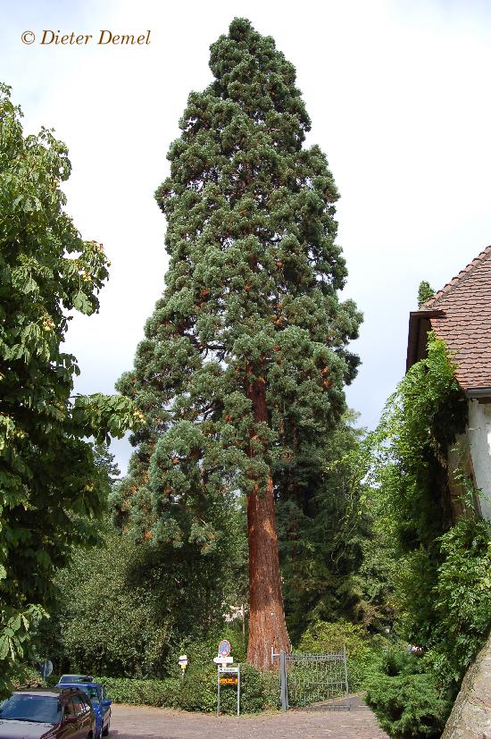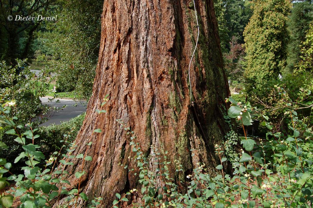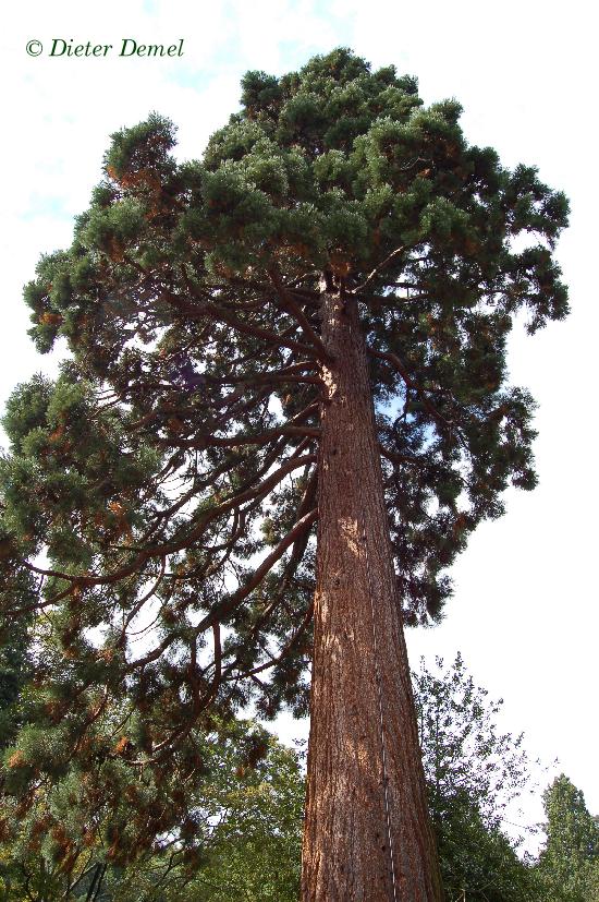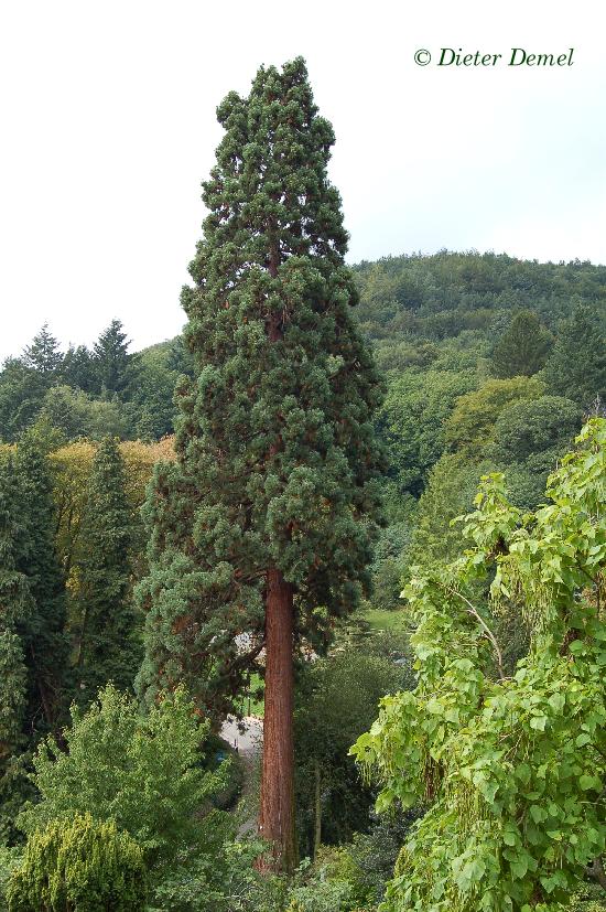 Hier gedeihen neben vielen exotischen Pflanzen und Gehölzen auch einige stattliche (ich glaube mindestens 2 Exemplare) vom Berg-Mammutbaum 'Sequoiadendron giganteum'. Einer ist sogar mit einem Blitzableiter ausgerüstet worden!