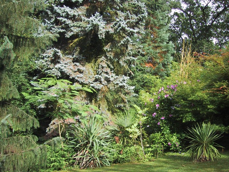 Hibiscus syr.-Hybride (blau/violett), umgeben von li: Picea breweriana,Albizzia julibrissin,Sequoiadendron giganteum, Phyllostachys bambus. Castillon.,Acer palm.Seiryu ,Yucca rec. u.Trachy