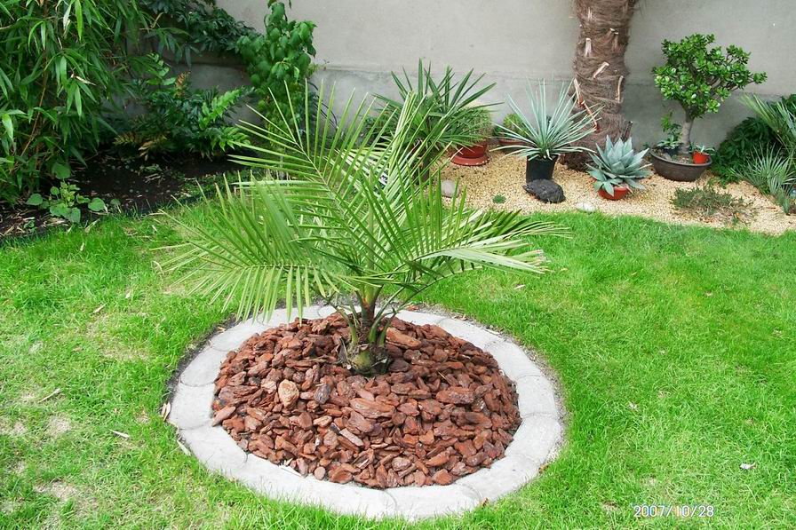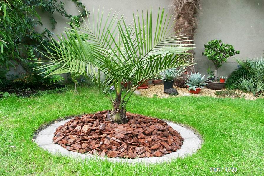 /*Jubaea chilensis*/leicht erhöht gepflanzt,mit grober Pinienrinde abgedeckt