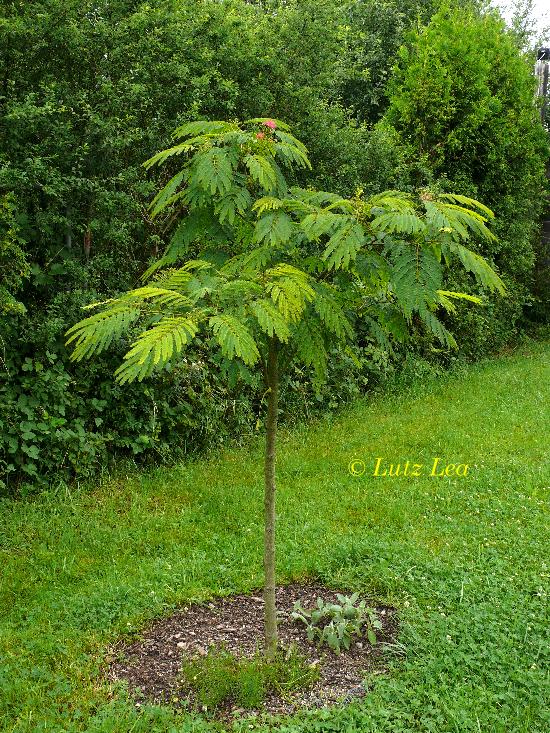 unsere Albizie, die ich mit Sohnemann Daniel im Sommer 2006 bei großer Hitze (Juli) auf der "Ponderosa" pflanzte, hat nun seit vergangenem Samstag die ersten Blüten geöffnet. Der lehmige Boden und das oft zu nasse Gelände scheint dem Seidenrosenbaum zum Glück bisher wenig auszumachen: