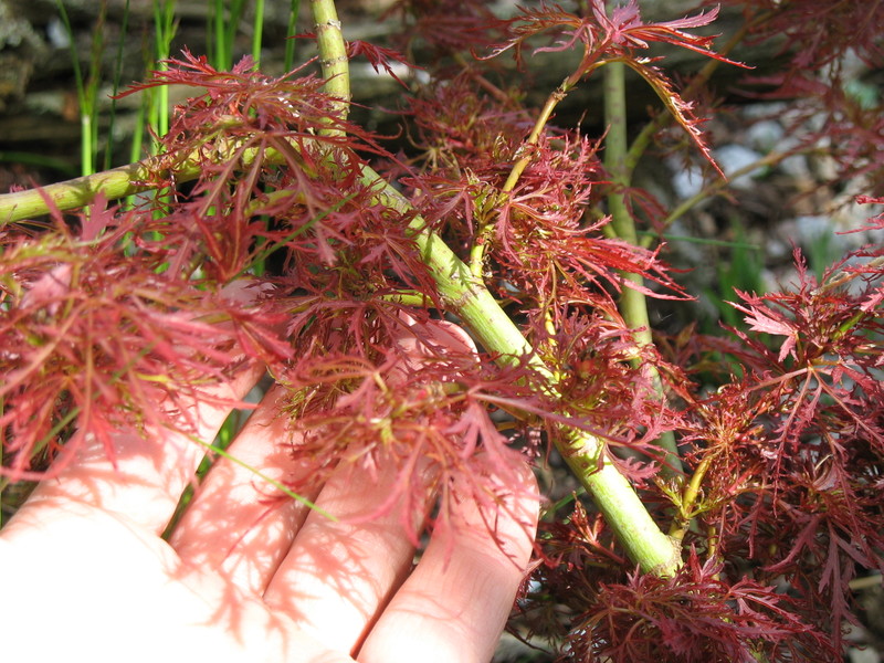 Acer palmatum 'Red Baby Lace' ungemein feingefiedert und wunderschön Rot im Austrieb. Über Sommer und Herbst einfach Bunt in verschiedenen Tönen.
