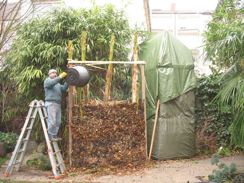 Heute wurde die kürzlich gezeigte Musa basjoo-Gruppe endlich verpackt. Die mit Maschendraht umgebene Stellage wurde mit Herbstlaub, Kompost, Schnittgut, den zerhackten Musablättern befüllt und dann.....