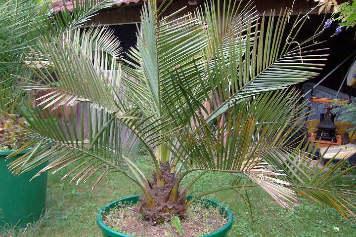 2001 kaufte ich mir diese Jubaea(Bild unten vom 2.04.02).Bis zu diesem Frühjahr stand sie im ungeheizten Wintergarten.Vor ein paar Wochen habe ich sie in eine 200Ltr. Regentonne gepflanzt und nach draußen gestellt.Durch die veränderten Lichtverhältnisse haben die Blätter etwas gelitten,aber die neuen Blätter sehen wieder gut aus.Auch produziert sie fleißig Jubaeahaken.