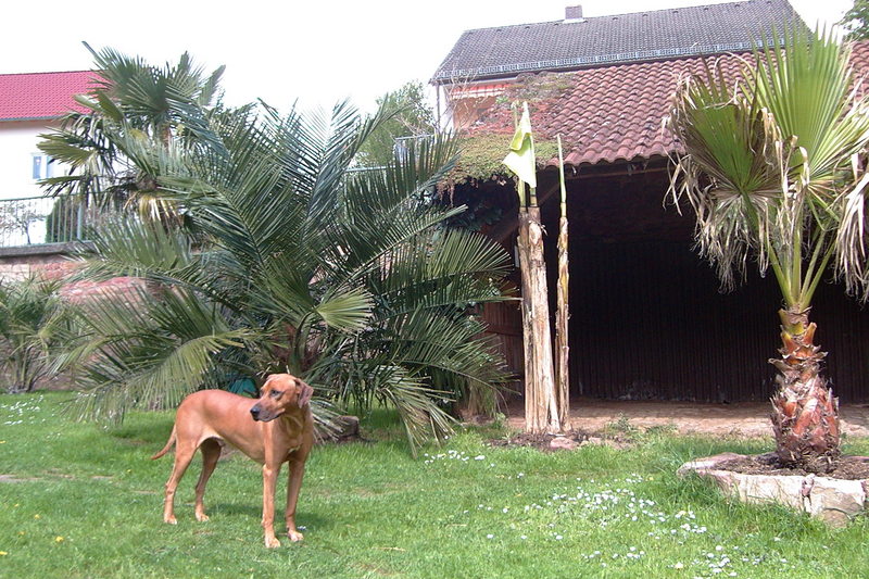Und hier mein Hund,ein Palmen-Ignorant,fast so schlimm wie der Palmenrüsselkäfer.Vielleicht hat er auch nur eine Lernschwäche.Er verwechselt nämlich ständig Palmen mit Laternenpfählen