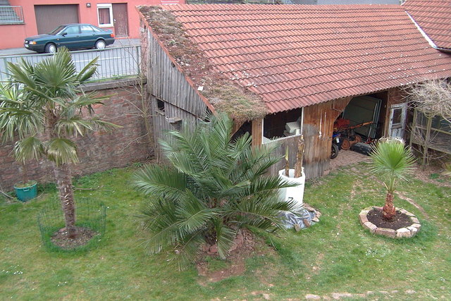 Die Blattspitzen der Washy,die durch einen Styroporturm geschützt waren,sind etwas gelb geworden,aber ich hoffe,dass sie in ihrem 2. Freilandsommer kräftig durchtreibt und viele neue Blätter bekommt.
