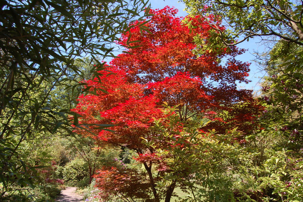 /*Acer palmatum Atropurpureum*/ neben Bashania fargesii.Die Rotfärbung ist bei vielen Sorten 2x im Jahr extrem intensiv! AM#