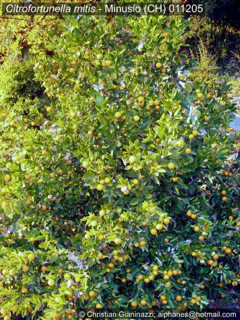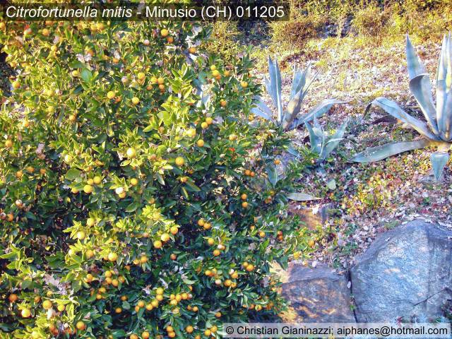 die Calamondin ist nicht besonders frostresistent; die folgenden Bilder zeigen ein Exemplar im Tessin, das trotz günstiger Lage an einem Südhang, mit Vliesschutz bei Frost und Minima nicht kälter als -5°C im Frühjahr immer wieder leichte Frostschäden aufweist.
