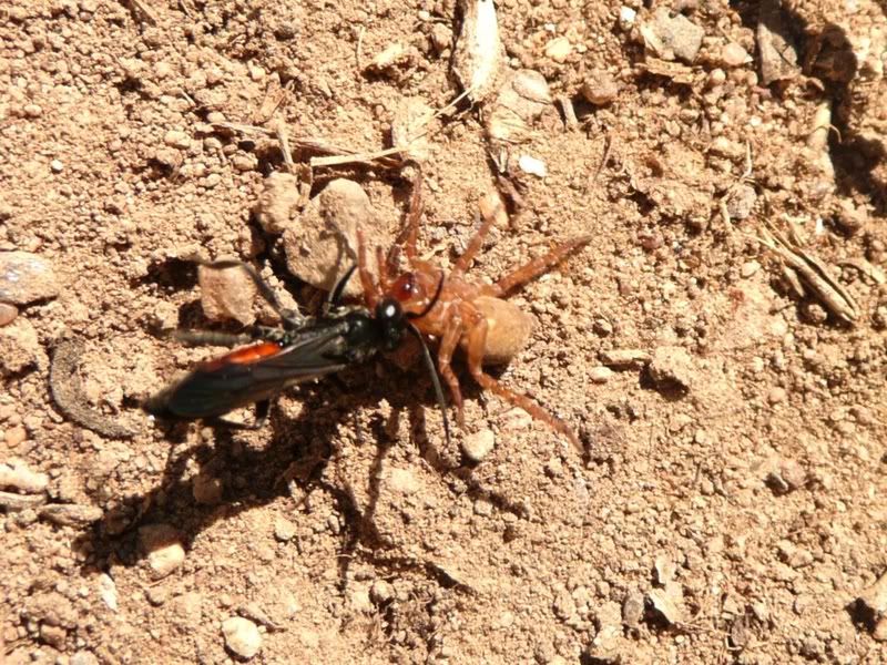 Schlupfwespe (Ichneumon spec.?) mit Beutespinne (Finsterspinne, Coelotes terrestris?)