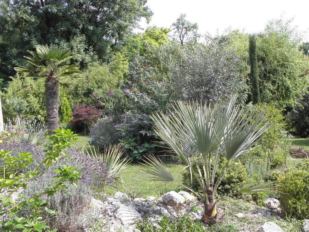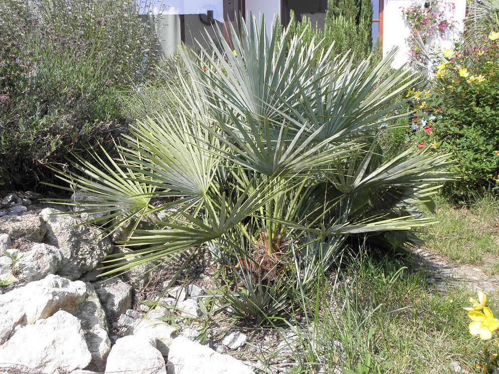 /* Trachycarpus wagnerianus */, /* Chamaerops humilis */ und im Hintergrund /* Brahea armata */ und /* Nannorrhops ritchiana */