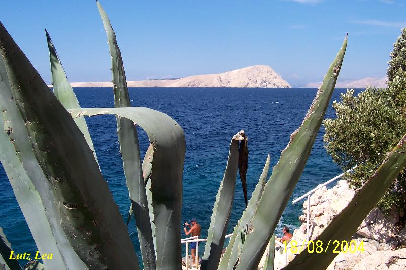 BILD 7 zeigt die Insel in der Mitte des Bildes, fotografiert durch 'Agave americana', welche recht häfig in 'Donja Kalda' anzutreffen ist.