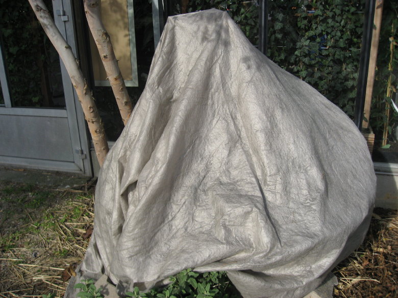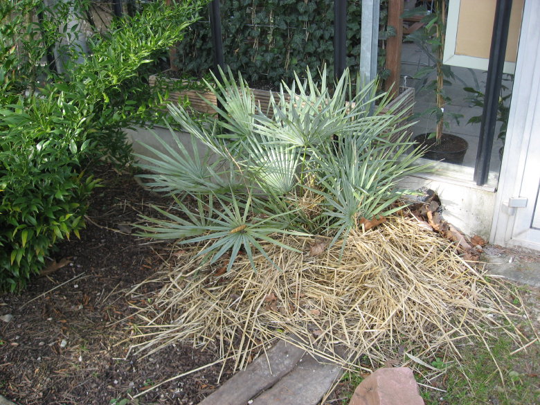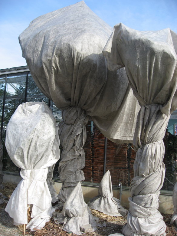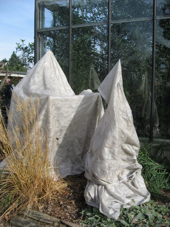 Winterschutz verschiedene (Yuccas, Sabal, das groesste muesste eine Tritrinax campestris sein.) Die Wedel einiger Palmen muessen also unter dem leichten Vlies eng zusammengebunden sein.