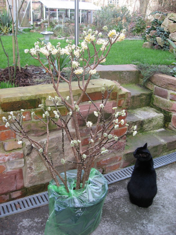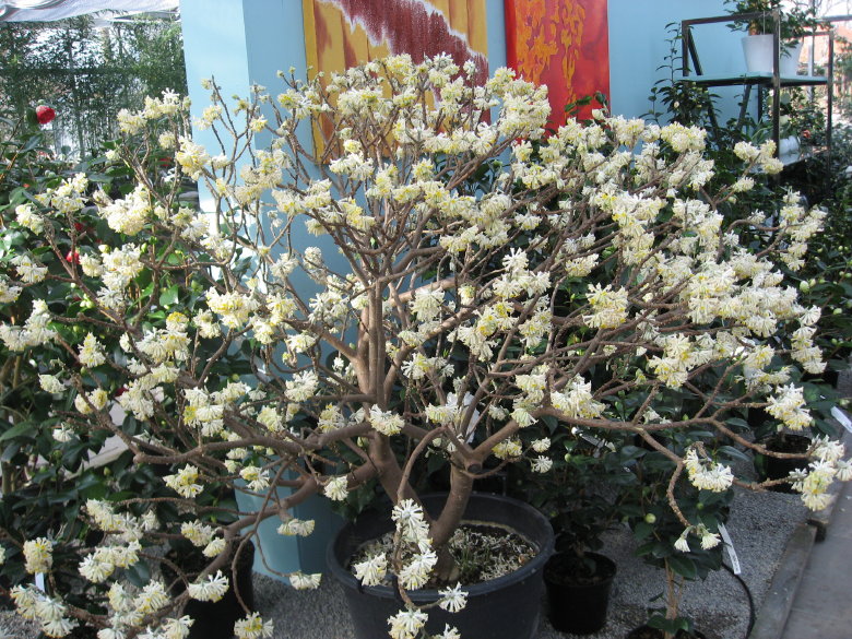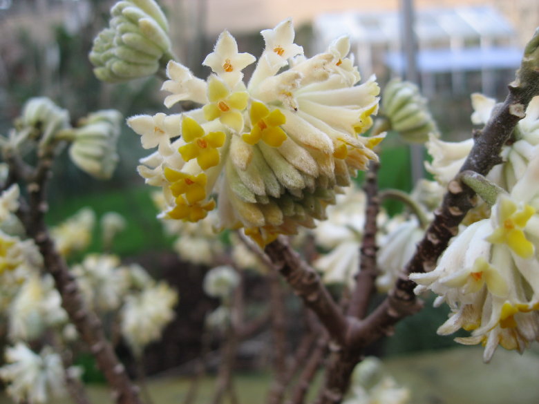 Im Gewaechshaus waren natuerlich (wie immer) wunderschoene Kamelien, leider habe ich das Fotografieren vergessen, weil ich diese tolle (und unbezahlbare) Edgeworthia entdeckte. Hinter dieser Art bin ich her, seit ich ein Exemplar im Staudensichtungsgarten in Weinheim sah. Und wenn hier im Forum andere Teilnehmer ihre Pflanzen zeigen, hilft das nicht gegen diesen Wunsch...