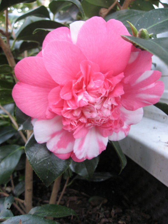 Und weil ich am Anfang von Kamelien gesprochen hatte, hier wenigstens noch eine der Blueten, die in meinem Garten schon aufgegangen sind. Das muesste C. jap. Collettii sein, gepflanzt im Fruehjahr 05.