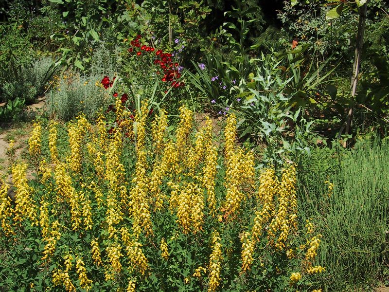 Ein kleiner Ausschnitt aus meinem Steppengarten mit Cyt. nigricans,Santolina,Rosa glauca,Mahonia trifoliata,Ephedra....