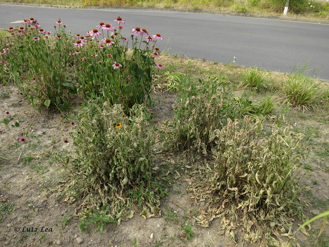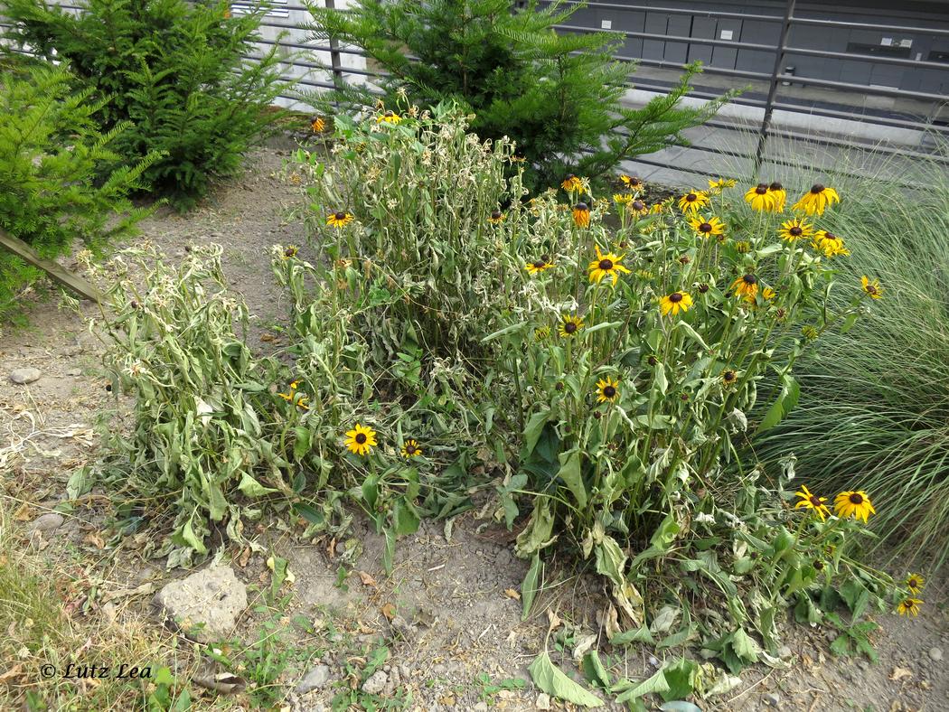 In den Staudenbeeten bei der DFS sieht es schlimm aus - der rote Sonnenhut packt es gerade noch so, aber Rudbeckia leidet sehr!