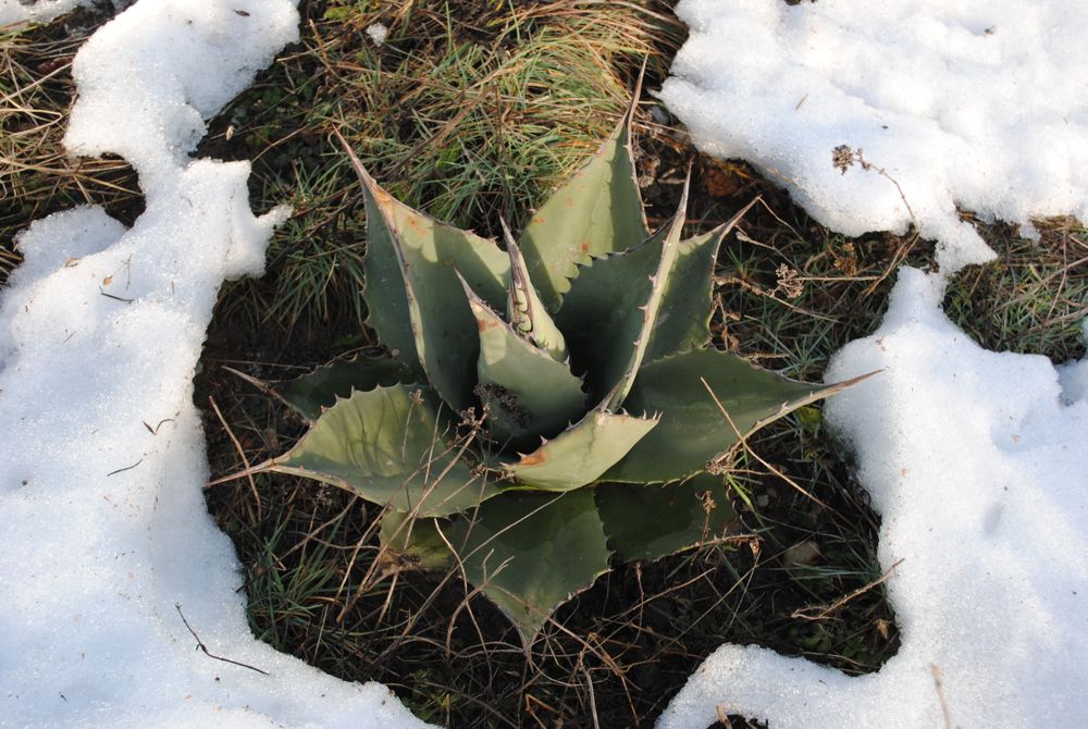 Agave havardiana bekam unterm Schnee Feuchtigkeitsschäden. Die hab ich als einzige Agave schon groß gekauft. Ist eigenartigerweisee auch die einzige mit Schäden. Vielleicht sollte man doch eher Sämlinge und Jungpflanzen setzen?