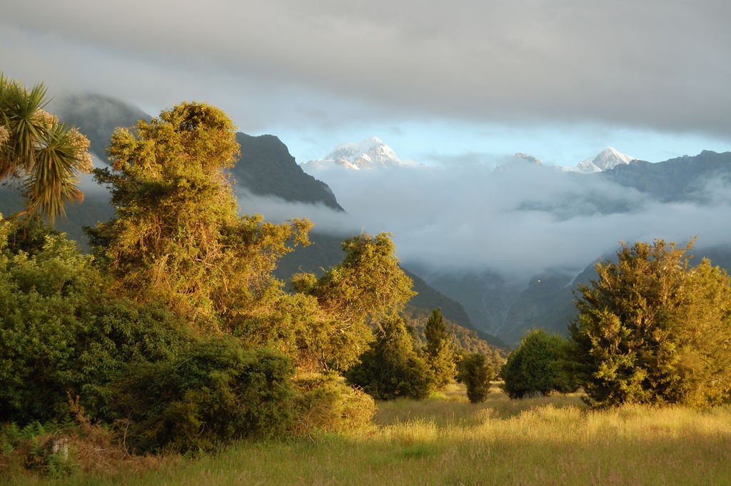 Am Abend riss die Wolkendecke auf und gab den Blick frei auf den höchsten Berg NZs.Li blühende Cabbage Trees (/*Cordyline australis*/ die bei vielen heftige Allergien auslösen können