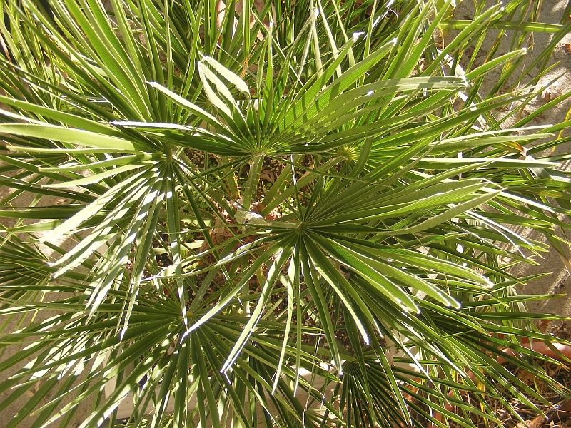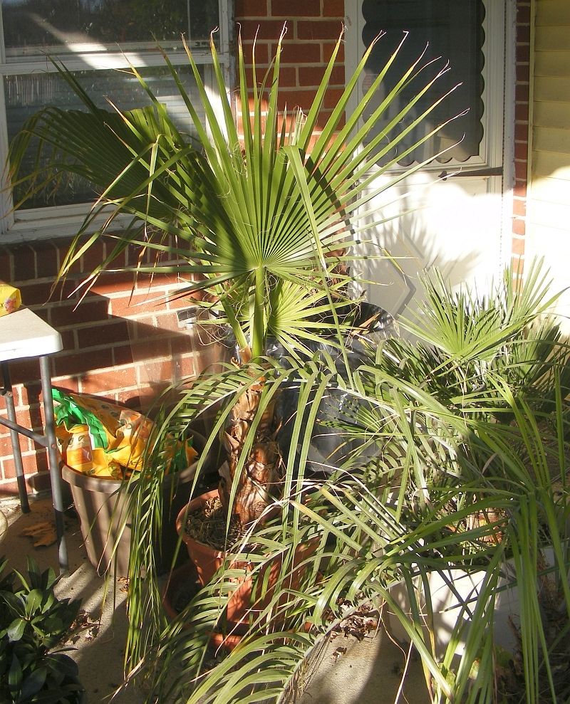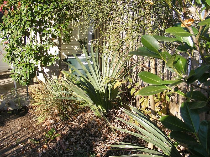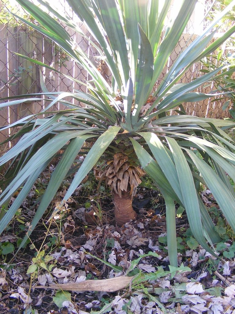 Y. Recurvifolia. Finally, the mosquitoes are tamped down enough that I had a chance to get in there and trim off the dead leaf skirt so that you can see the bit of trunk this thing has.